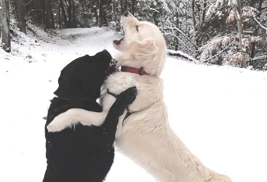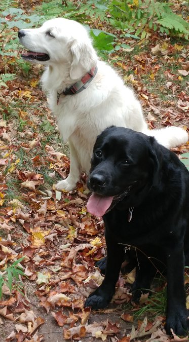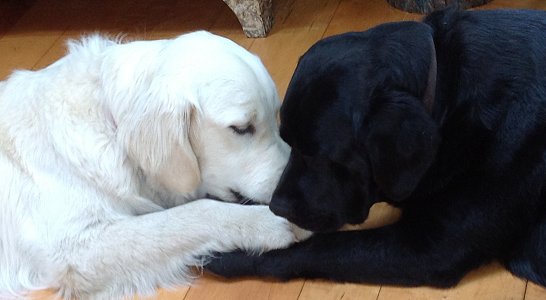 Late 2017: I have been very remiss in not featuring Tilly, Elmer's girlfriend, here. She is a huge part of his life. He adores her, and vice versa. Although she likes to totally dominate him. He submits like the total milquetoast he is. He is now 9 and she is 5. When she was a tiny puppy, Elmer terrorized her, so she has dedicated herself to a lifetime of payback. She is movie-star beautiful, and when I'm walking them, people often ask what kind of dog she is, I reply, "Platinum Retriever." As the pictures below (all by Missy Stevens) attest, they like to hang out together, canoodle, and wrassle!