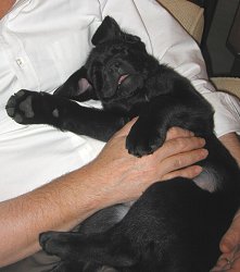 Like all puppies, he's good at sleeping anywhere, anytime. We have lots of dog beds, and the comfort of Rex's arms.