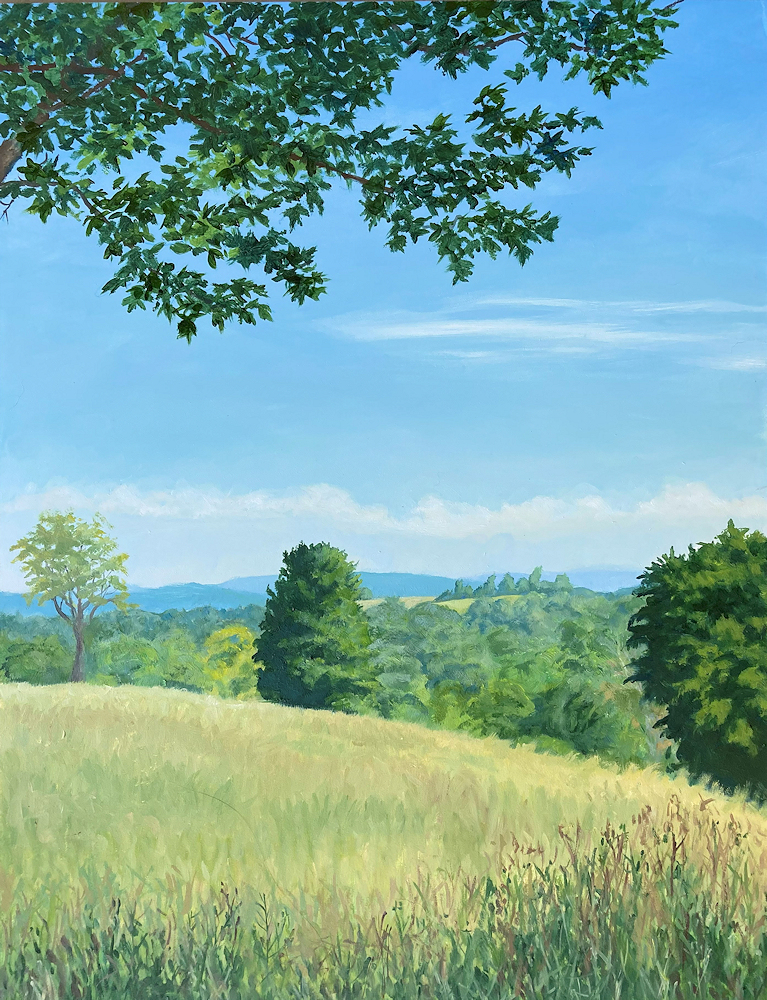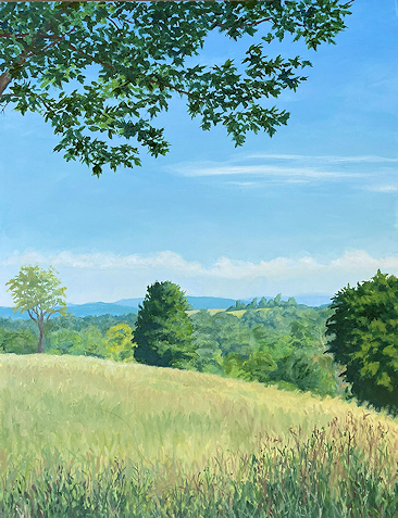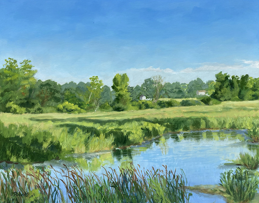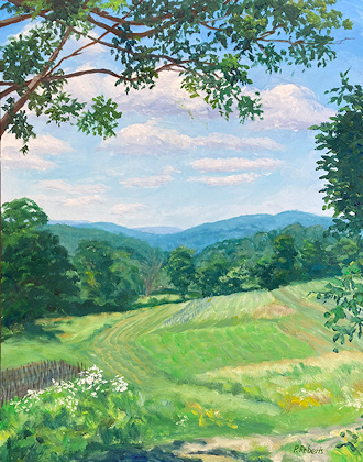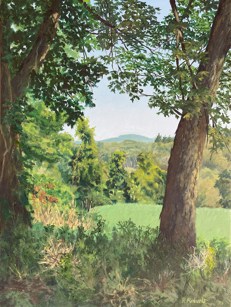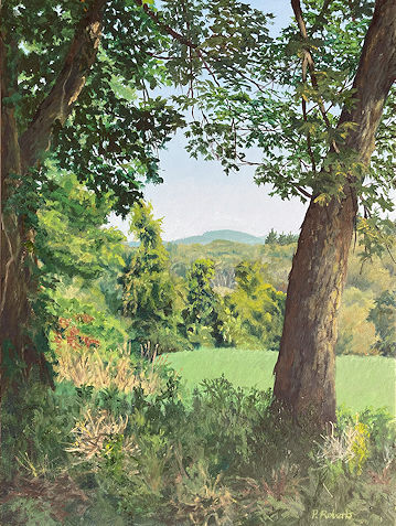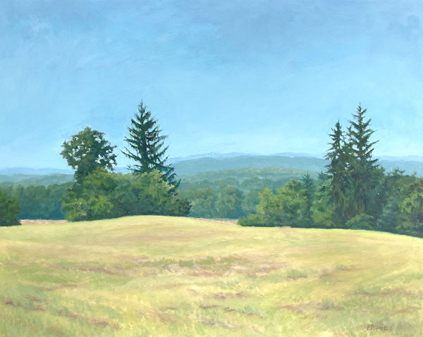 Painting with oils on either panel or Arches cotton paper, I work on-site (en plein air), trying to convey the quality of light and space. This is both fun and frustrating, since the light constantly changes and shifts, not only by the minute, but from day to day, with temperature and humidity. And when the light shifts, the way you see space and distance changes, so it's a race to capture the essence of the scene.