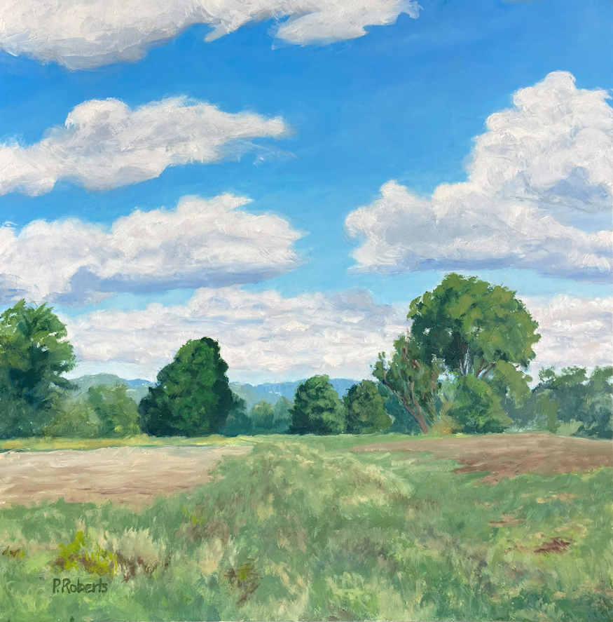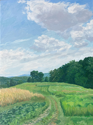 Painting with oils on either panel or Arches cotton paper, I work on-site (en plein air), trying to convey the quality of light and space. This is both fun and frustrating, since the light constantly changes and shifts, not only by the minute, but from day to day, with temperature and humidity. And when the light shifts, the way you see space and distance changes, so it's a race to capture the essence of the scene.I love sitting in a field hearing the bugs and birds going about their business. And I'm lucky enough to live in a place where there's open land that probably hasn't changed much in generations.